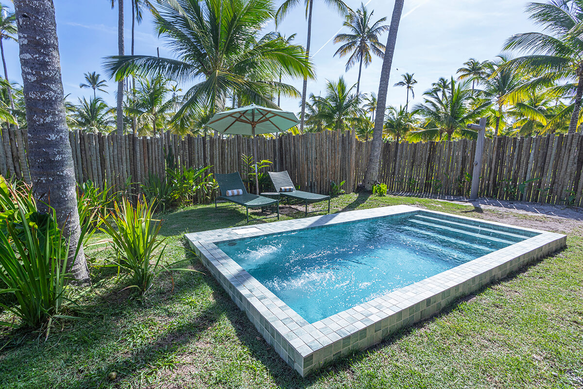 Beira Mar, com mais de 150m², área privativa com piscina aquecida, lindo e amplo jardim, total exclusividade, banheira de imersão dentro do bangalô, terraço exclusivo com rede e gazebo, conforto, aconchego e muita natureza.